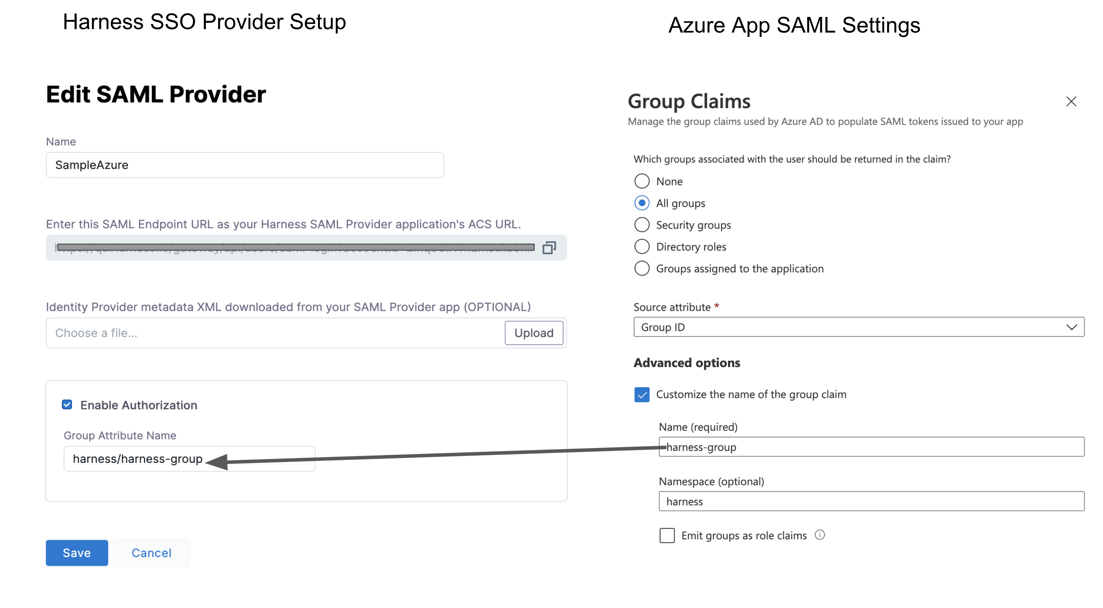 • SAML metadata file: This file is provided by your SAML provider app. You upload this file into the Harness Single Sign-On (SSO) Provider dialog to integrate the app with Harness.